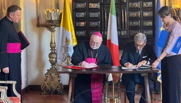 The agreement was signed on 31 July 2025 at the Italian Embassy to the Holy See. Archbishop Paul Richard Gallagher, Secretary for Relations with States and International Organisations, signed on behalf of the Holy See, while Ambassador Francesco Di Nitto represented the Italian Republic.