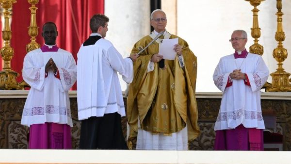 Pope Leo during Sunday's canonization of Pier Giorgio Frassati and Carlo Acutis, just before leading the Angelus prayer (@Vatican Media)