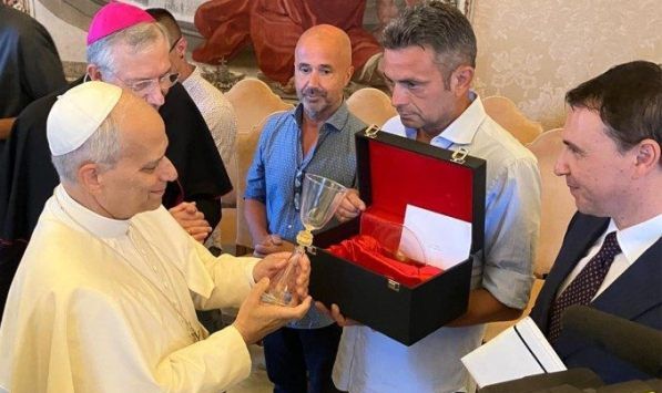 One of the pilgrim inmates presents a chalice to Pope Leo XIV during their audience Thursday morning (photo credit: © Gente Veneta, weekly magazine Diocese of Venice)