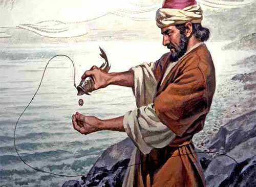 When they came to Capernaum, the collectors of the temple tax approached Peter and said, 'Does not your teacher pay the temple tax?' 'Yes,' he said. When he came into the house, before he had time to speak, Jesus asked him, 'What is your opinion, Simon? From whom do the kings of the earth take tolls or census tax? From their subjects or from foreigners?' When he said, 'From foreigners,' Jesus said to him, 'Then the subjects are exempt. But that we may not offend them, go to the sea, drop in a hook, and take the first fish that comes up. Open its mouth and you will find a coin worth twice the temple tax. Give that to them for me and for you.'