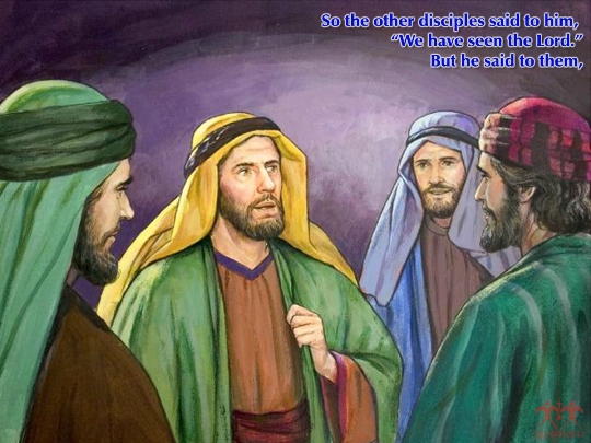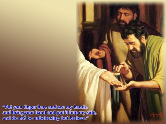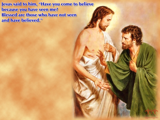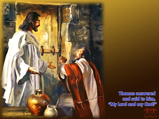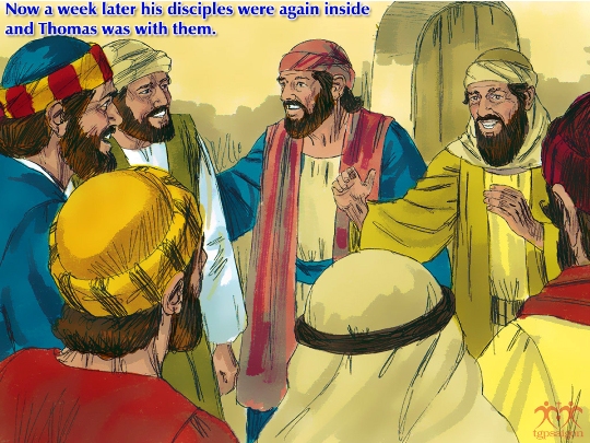 Eight days later, the disciples were inside again and Thomas was with them. Despite the locked doors Jesus came and stood in their midst and said, 'Peace be with you'. Then He said to Thomas, 'Put your finger here and see my hands; stretch out your hand and put it into my side. Resist no longer and be a believer'. Thomas then said, 'You are my Lord and my God'. Jesus replied, 'You believe because you see me, don't you? Happy are those who have not seen and believe'.