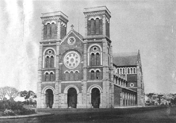 Established by French colonists, the cathedral was constructed between 1863 and 1880. It has two bell towers, reaching a height of over 58 meters (190 feet). Following the French conquest of Cochinchina and Saigon, the Roman Catholic Church established a community and religious services for French colonialists.
