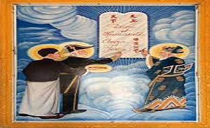 The figure on the right is Trang Trinh Nguyen Binh Khiem (Thanh Son Dao Si) a highly respected Vietnamese poet and prophet of the 16th Century. He writes in Chinese characters the agreement between God and Humanity. This Agreement also appears in French. These two languages join Eastern and Western Civilisation with the same message. Translated into English these words are 'God and Humanity' and 'Love and Justice.'