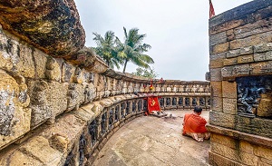 No two Yogini temples have the same set of Yoginis on their walls. At Hirapur, for example, one sees the rare murti of Vinayaki, the Shakti of Vinayaka or Ganesha. The chief Yogini in Chausath, located opposite the entrance, is Mahamaya, who stands upon a human head. Well adorned with garments and flowers, She is worshiped regularly. Other Yoginis, too, are offered flowers. In the middle is a platform with Bhairava murtis. Chandi Path, the most popular yagna for Shakti worship, is performed here during Navaratri. On the outer periphery of the circular temple are nine larger murtis of Goddess Durga. In the middle of Mahamaya Pushkarni tank, close by, is a small square temple, as is typical of village tanks in Odisha.